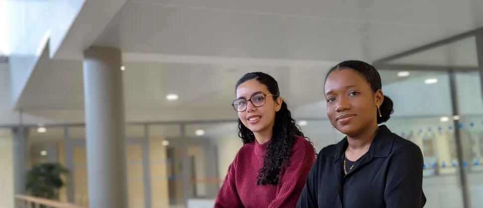 Wiam et Haïriya dans le grand hall du campus Paris-Saclay de l'ENSTA